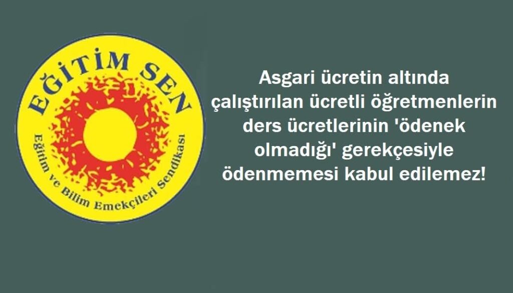 Millî Eğitim Bakanlığına seslenen Eğitim Sen, asgari ücretin altında aldıkları ücretlerle geçinmeye çalışan ücretli öğretmenlerin ders ücretlerinin bir an önce ödenmesini talep etti.