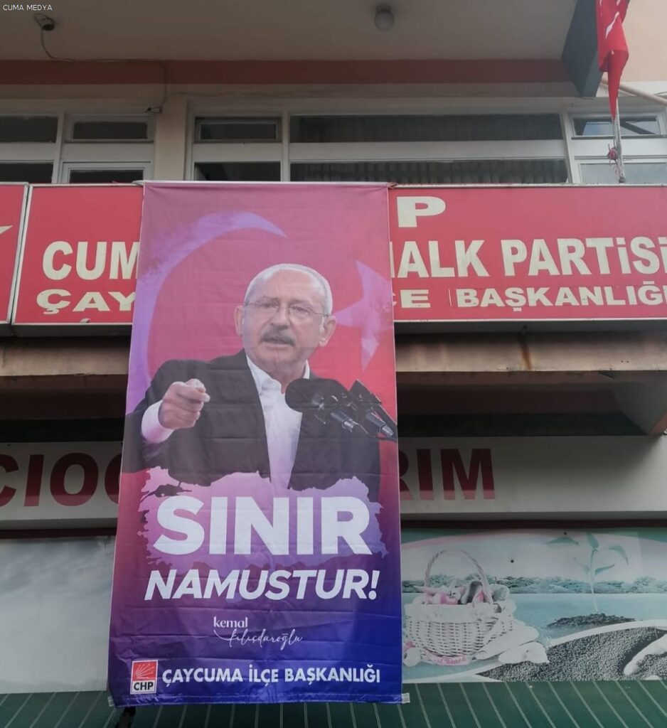 Geçtiğimiz günlerde binlerce Afgan ve Suriyelinin Türkiye sınırlarına dayanmasının ardından CHP Genel Başkanı Kemal Kılıçdaroğlu’nun “Sınır namustur” sloganı çerçevesinde CHP Çaycuma İlçe Başkanlığı binasına da pankart asıldı.